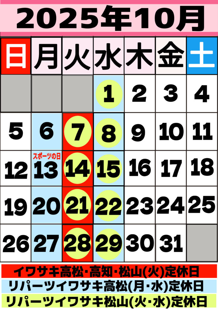 10月からはリパーツ高松店が毎週月・水曜日が定休日、火曜日は営業になります。
