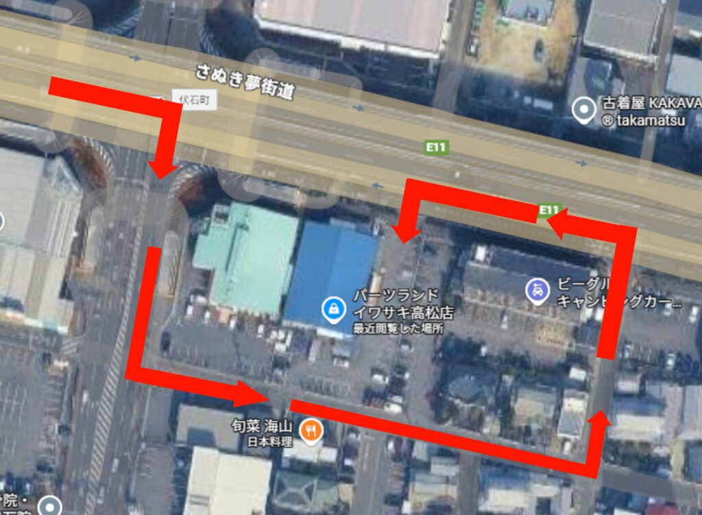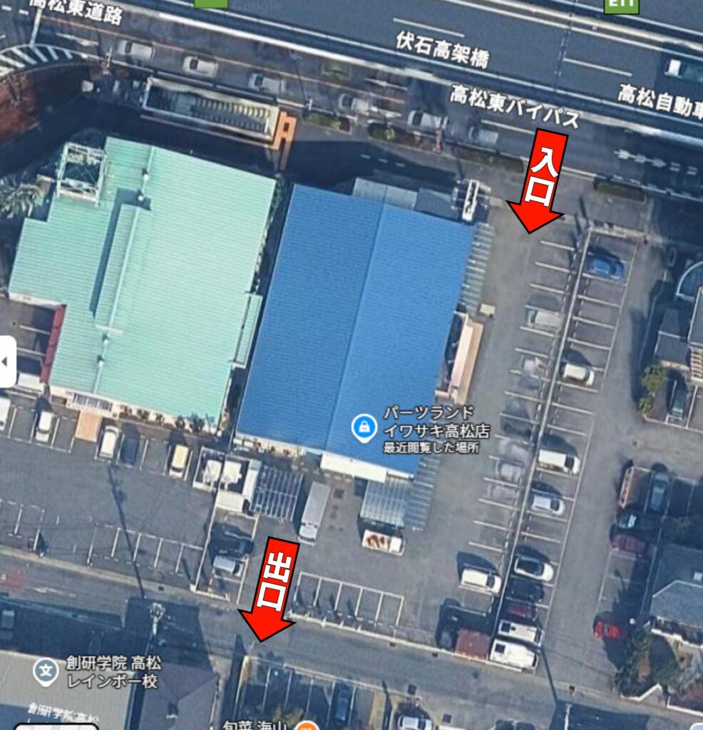 西方面から来られる方(高松西ICでお降りの方)は、お手数ですが伏石町交差点を右折していただき、カラオケ屋さんを左折→イワサキの裏道を進んで1つ目の曲がり角を左折→国道11号バイパスに出ますので、そのまま表口まで進んでお入りください。