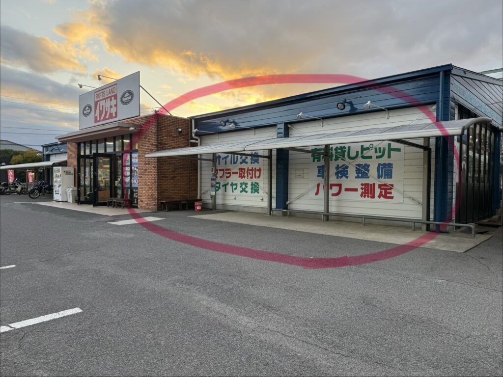 Sちゃんブースと吉田選手のマシン展示は、当店表口を入ってすぐ右手の駐輪スペース(店舗の壁沿い、丸で囲んだところ)になります!