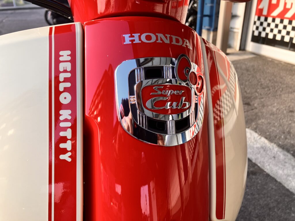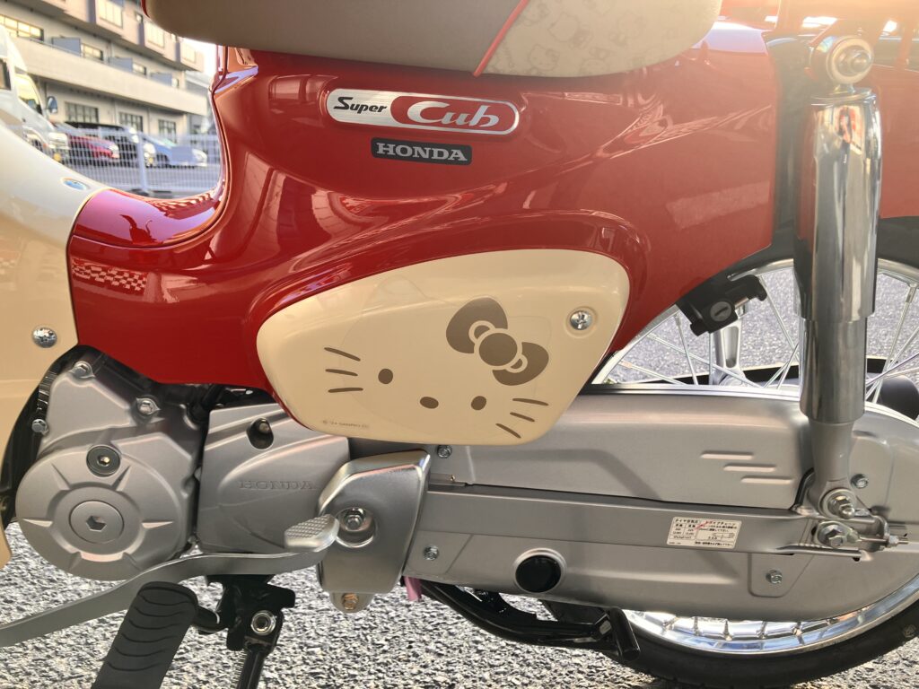 レッグシールドの前部とリアフェンダーの側面にハローキティのロゴ、