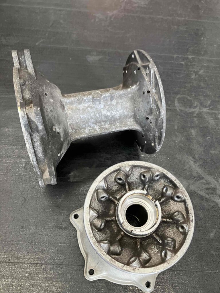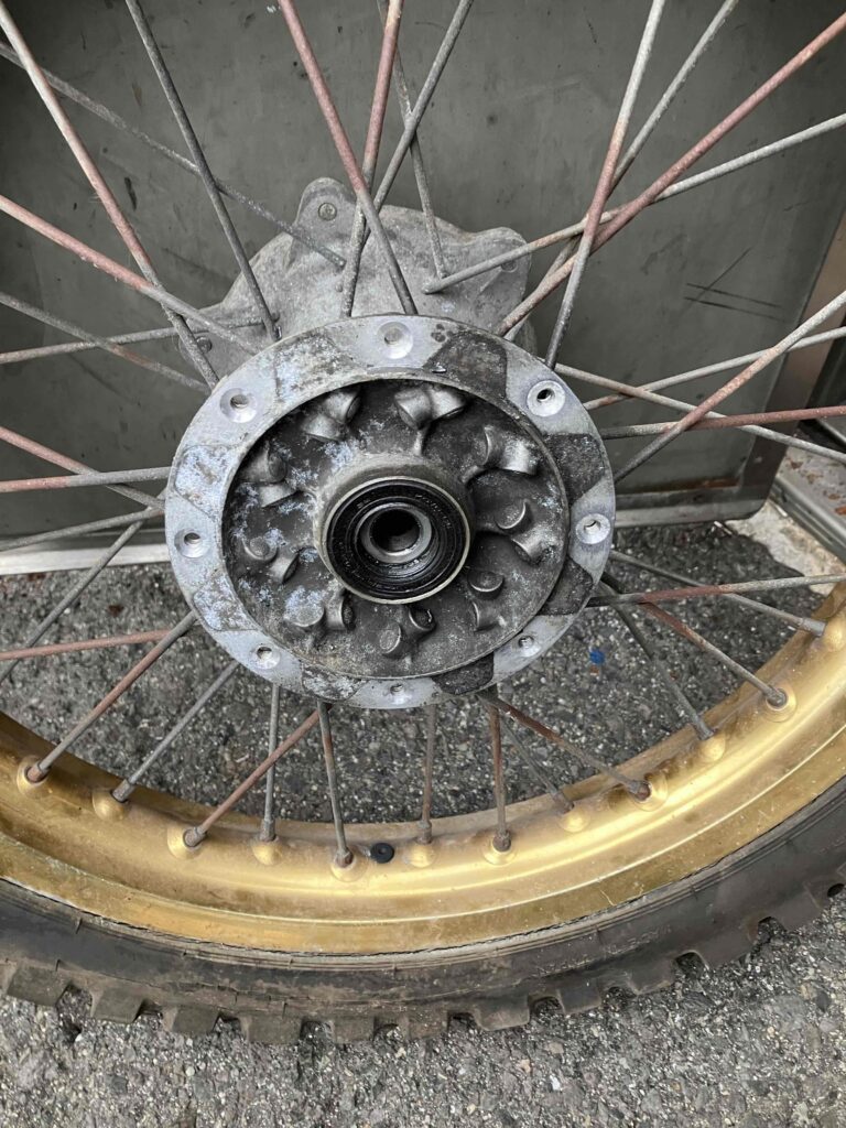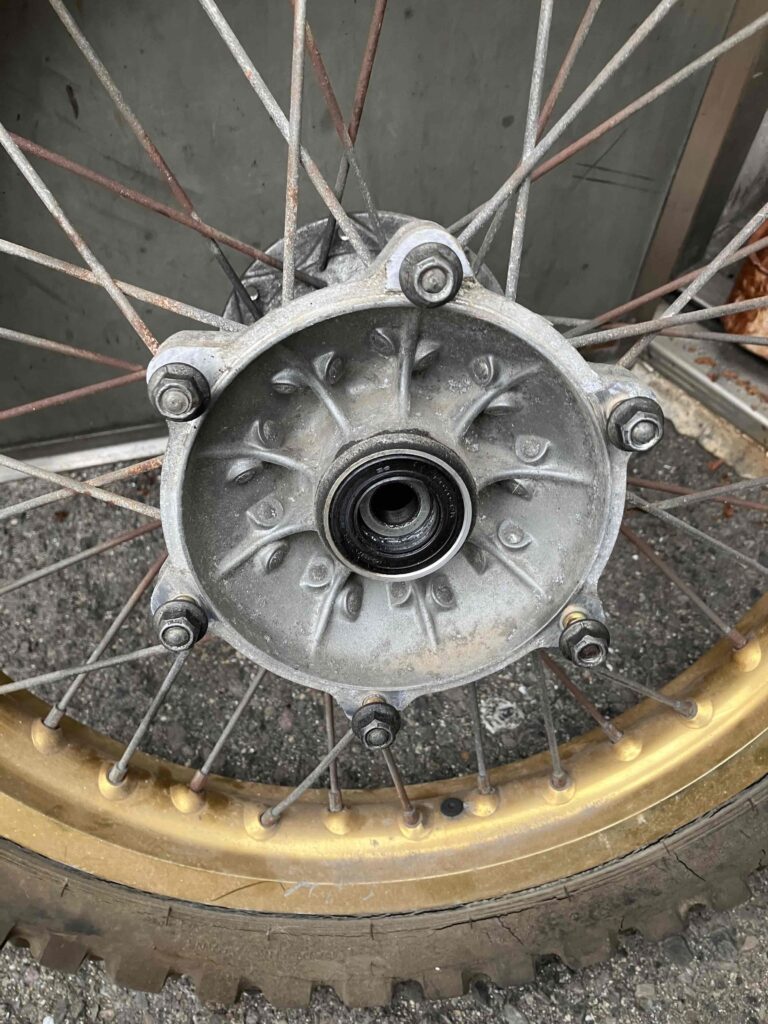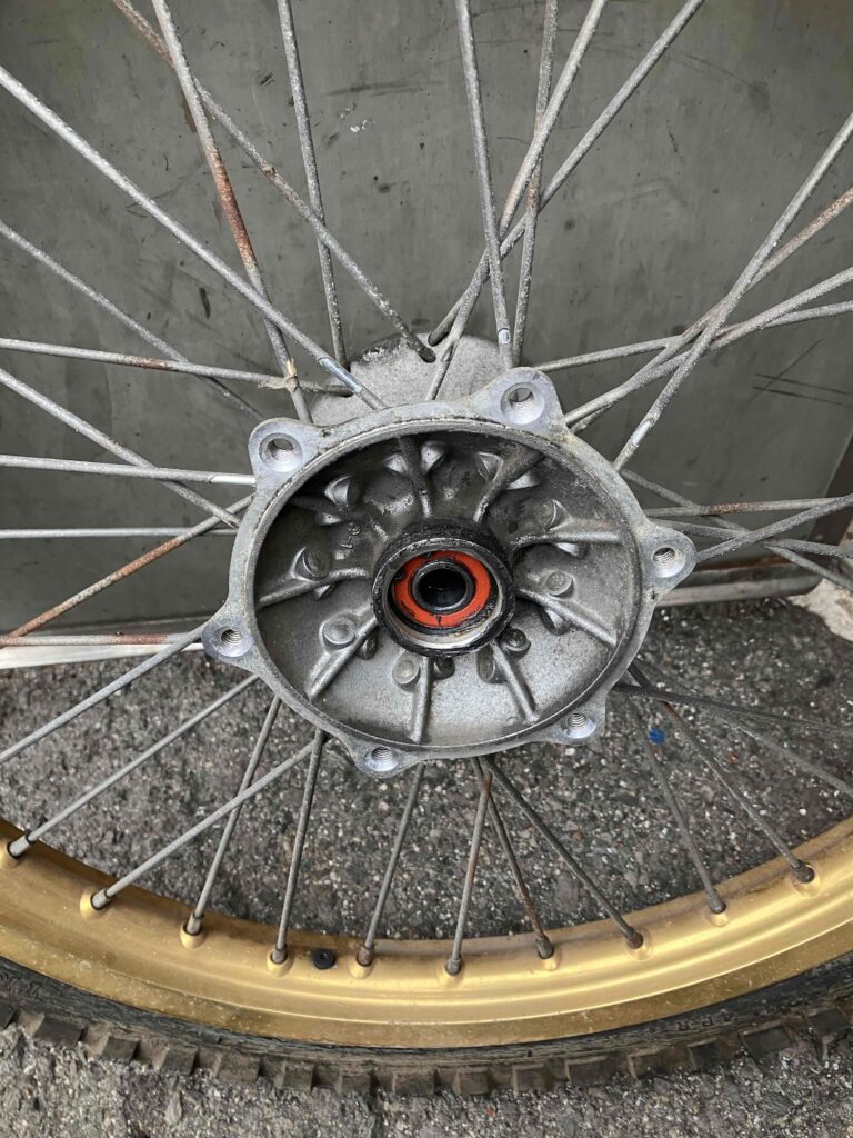 オフロードバイクのホイールですが、スポークはサビサビ・ハブは白サビと汚れで、とてもヤレた感じがします。ショボーン(´;ω;`)